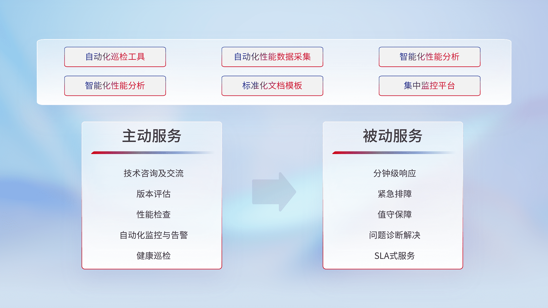 智能化工具和标准化文档,,保障服务质量,,,提供主动服务(包含技术咨询、、、、版本评估、、性能检查、、、、自动化监控与告警、、、健康巡检)和被动服务包含(分钟级响应、、、紧急排障、、、、值守保障、、、、问题诊断解决、、、SLA服务)。。